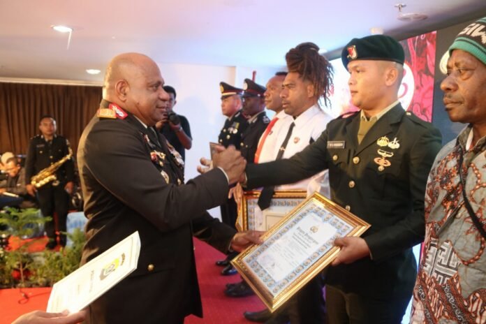 Harnas.id, Papua – Acara syukuran dalam rangka memperingati HUT Bhayangkara ke-78, Kapolda Papua, Irjen Pol. Mathius D. Fakhiri, memberikan penghargaan yang luar biasa kepada Prada Triwandi Werfan Sentana Nababan, anggota Batalyon Infanteri 751/VJS. Acara syukuran tersebut berlangsung di Ball Room 2 Cyclop Wisma Atlet Stadion Mandala saat perayaan Hari Bhayangkara, Jayapura, (01/07/2024).