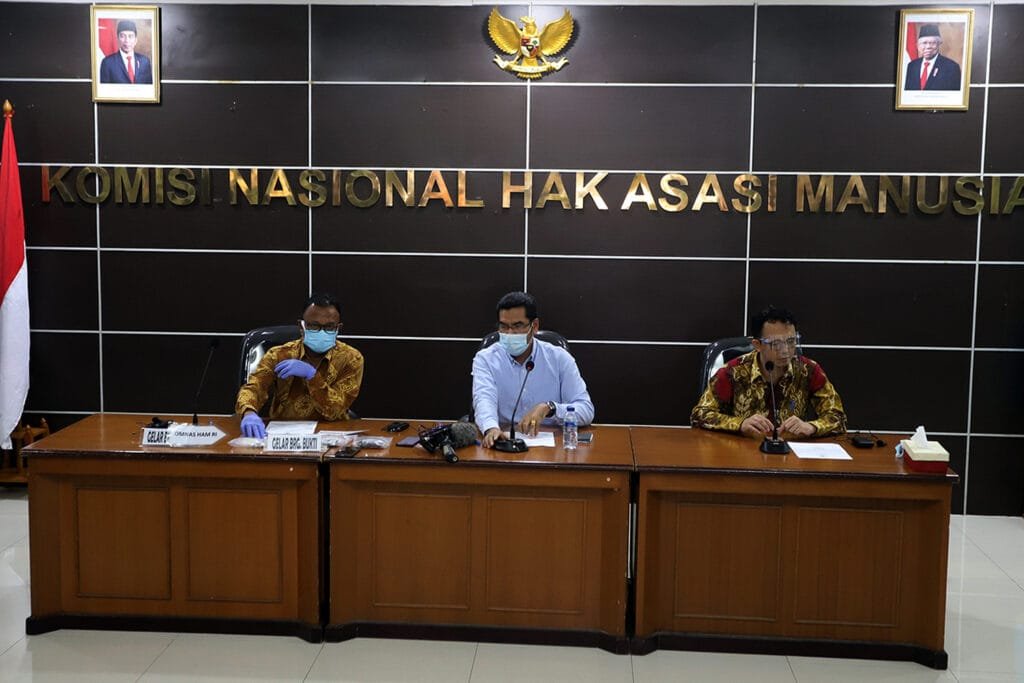 (Dari kiri) Komisioner Komnas HAM Mohammad Choirul Anam, Wakil Ketua Eksternal Komnas HAM Amiruddin dan Komisioner Komnas HAM Beka Ulung Hapsara menyampaikan hasil temuan Komnas HAM terkait penembakan di Jalan Tol Jakarta-Cikampek KM 50 yang menewaskan enam Laskar FPI di Kantor Komnas HAM, Jakarta, Senin (28/12/2020). Komnas HAM menemukan sejumlah barang bukti di sekitar tempat kejadian perkara (TKP) di antaranya proyektil dan selongsong peluru, serpihan mobil, serta bagian dari CCTV. HARNAS.ID | BARRI FATHAILAH