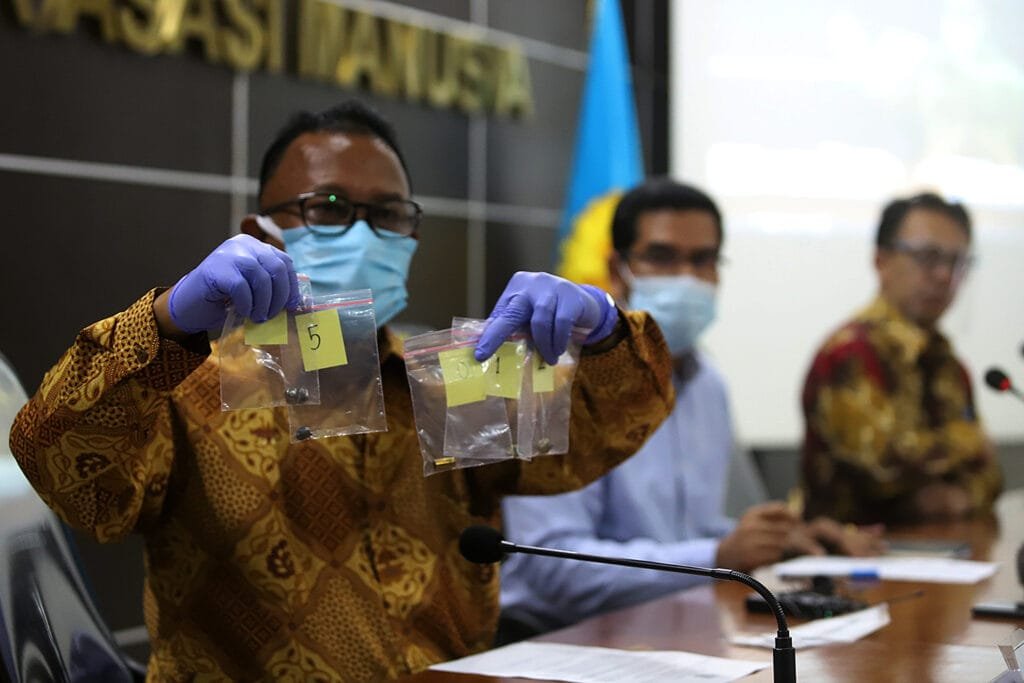 Komisioner Komnas HAM Mohammad Choirul Anam menunjukkan barang bukti hasil temuan Komnas HAM terkait penembakan di Jalan Tol Jakarta-Cikampek KM 50 yang menewaskan enam Laskar FPI di Kantor Komnas HAM, Jakarta, Senin (28/12/2020). Komnas HAM menemukan sejumlah barang bukti di sekitar tempat kejadian perkara (TKP) di antaranya proyektil dan selongsong peluru, serpihan mobil, serta bagian dari CCTV. HARNAS.ID | BARRI FATHAILAH