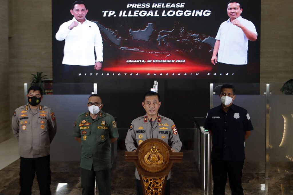 Kepala Biro Penerangan Masyarakat Mabes Polri Brigjen Pol Rusdi Hartono (dua kanan) menyampaikan keterangan pers saat rilis kasus perusakan hutan atau illegal logging di Kantor Bareskrim Mabes Polri, Jakarta, Rabu (30/12/2020). Bareskrim menetapkan RPS, pemilik UD Karya Abadi sebagai tersangka tindak pidana illegal logging di Kabupaten Katingan, Kalimantan Tengah dengan barang bukti kayu bulat sebanyak 150 batang, kayu olahan 6586 keping, sejumlah alat berat dan alat angkut serta dokumen. HARNAS.ID | BARRI FATHAILAHKepala Biro Penerangan Masyarakat Mabes Polri Brigjen Pol Rusdi Hartono (dua kanan) menyampaikan keterangan pers saat rilis kasus perusakan hutan atau illegal logging di Kantor Bareskrim Mabes Polri, Jakarta, Rabu (30/12/2020). Bareskrim menetapkan RPS, pemilik UD Karya Abadi sebagai tersangka tindak pidana illegal logging di Kabupaten Katingan, Kalimantan Tengah dengan barang bukti kayu bulat sebanyak 150 batang, kayu olahan 6586 keping, sejumlah alat berat dan alat angkut serta dokumen. HARNAS.ID | BARRI FATHAILAHTersangka RPS (memakai baju tahanan) dihadirkan saat rilis kasus perusakan hutan atau illegal logging di Kantor Bareskrim Mabes Polri, Jakarta, Rabu (30/12/2020). Bareskrim menetapkan RPS, pemilik UD Karya Abadi sebagai tersangka tindak pidana illegal logging di Kabupaten Katingan, Kalimantan Tengah dengan barang bukti kayu bulat sebanyak 150 batang, kayu olahan 6586 keping, sejumlah alat berat dan alat angkut serta dokumen. HARNAS.ID | BARRI FATHAILAHTersangka RPS (memakai baju tahanan) dihadirkan saat rilis kasus perusakan hutan atau illegal logging di Kantor Bareskrim Mabes Polri, Jakarta, Rabu (30/12/2020). Bareskrim menetapkan RPS, pemilik UD Karya Abadi sebagai tersangka tindak pidana illegal logging di Kabupaten Katingan, Kalimantan Tengah dengan barang bukti kayu bulat sebanyak 150 batang, kayu olahan 6586 keping, sejumlah alat berat dan alat angkut serta dokumen. HARNAS.ID | BARRI FATHAILAH