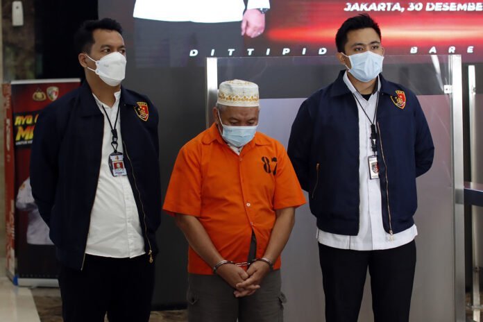 Tersangka RPS (memakai baju tahanan) dihadirkan saat rilis kasus perusakan hutan atau illegal logging di Kantor Bareskrim Mabes Polri, Jakarta, Rabu (30/12/2020). Bareskrim menetapkan RPS, pemilik UD Karya Abadi sebagai tersangka tindak pidana illegal logging di Kabupaten Katingan, Kalimantan Tengah dengan barang bukti kayu bulat sebanyak 150 batang, kayu olahan 6586 keping, sejumlah alat berat dan alat angkut serta dokumen. HARNAS.ID | BARRI FATHAILAH