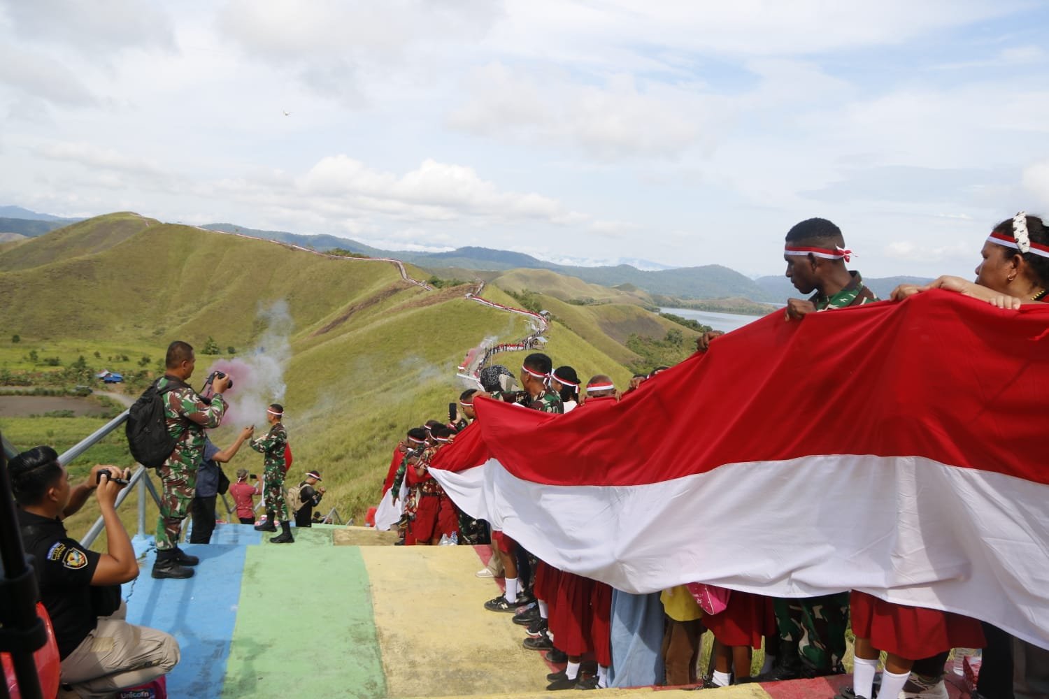 Harnas.id, Sentani-Papua – Dalam rangka memperingati Dirgahayu Republik Indonesia yang ke-79, sebuah acara istimewa digelar di Bukit Tungku Wiri, Kampung Doyo Lama, Distrik Waibhu, Jayapura. Acara ini ditandai dengan pembentangan bendera Merah Putih sepanjang 1000 meter sebagai simbol semangat persatuan dan kebanggaan bangsa, (12/07/ 2024).