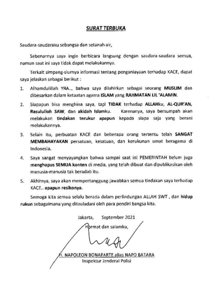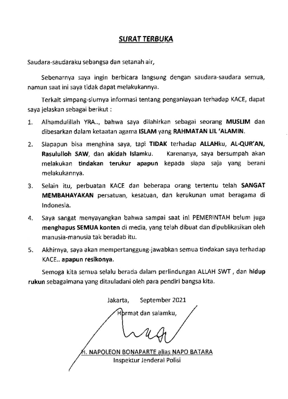 Melalui kuasa hukumnya, Haposan Batubara, Napoleon Bonaparte menulis surat terbuka usai dirinya dilaporkan karena menganiaya Kece, yang ditahan atas kasus penodaan agama di Rutan Bareskrim.