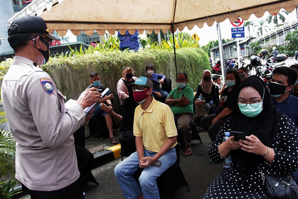 Warga mengantre hendak mengikuti rapid test antigen gratis di kawasan Pondok Indah Mal, Jakarta, Selasa (29/12/2020). Tes cepat antigen ini diselenggarakan oleh Polri untuk masyarakat di 10 Pos Pengamanan Operasi Lilin 2020 di wilayah Jakarta Selatan pada libur Natal 2020 dan Tahun Baru 2021. HARNAS.ID | BARRI FATHAILAH