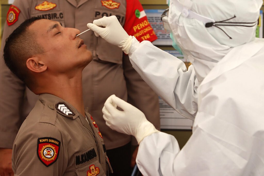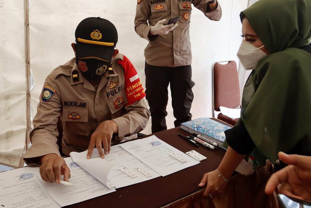 Anggota Polri mengikuti rapid test antigen gratis di kawasan Pondok Indah Mal, Jakarta, Selasa (29/12/2020). Tes cepat antigen ini diselenggarakan oleh Polri untuk masyarakat di 10 Pos Pengamanan Operasi Lilin 2020 di wilayah Jakarta Selatan pada libur Natal 2020 dan Tahun Baru 2021. HARNAS.ID | BARRI FATHAILAH