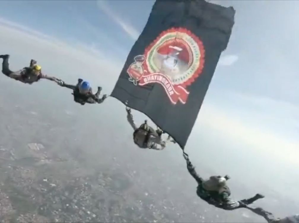 Dari rekaman video yang diterima, para penerjun bergantian keluar dari pesawat yang terbang di ketinggian 10 ribu kaki. Terlihat tiga orang lebih dahulu keluar, dua di antaranya berseragam Polri. Setelah itu personel lainnya mengikuti.