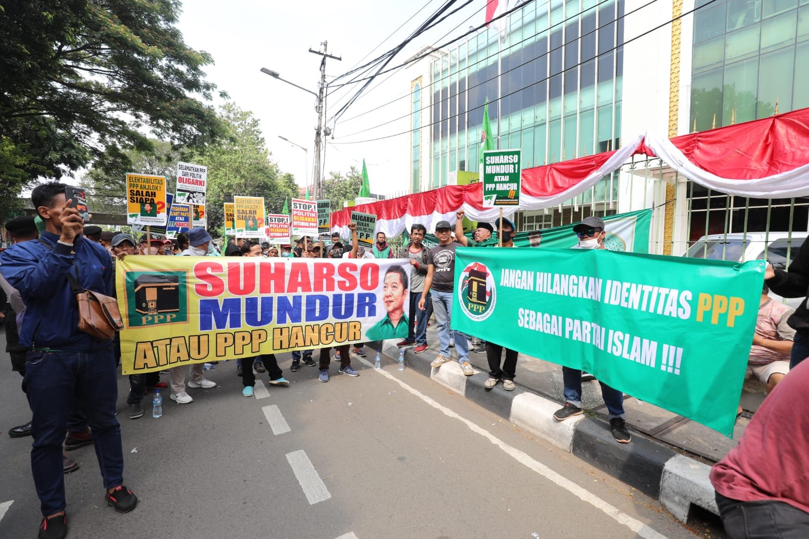 HARNAS.ID – Front Kader Penyelamat Partai (FKPP) aksi di depan Gedung DPP Partai Persatuan Pembangunan (PPP), Kamis (11/8/2022). Mereka menyebut aksi kali ini dilakukan untuk menyikapi pernyataan Ketua Umum PPP Suharso Monoara yang akan meninggalkan politik identitas partai.