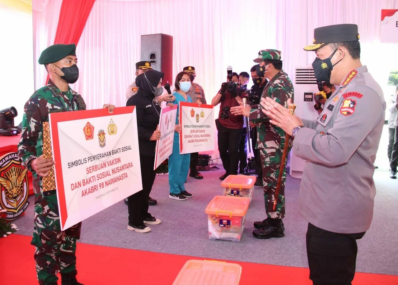 HARNAS.ID – Panglima TNI Marsekal Hadi Tjahjanto dan Kapolri Jenderal Listyo Sigit Prabowo meninjau langsung kegiatan serbuan vaksinasi dan bakti sosial yang diselenggarakan oleh Paguyuban Alumni AKABRI 1998 atau Nawahasta di WOW Sport Club Citra Raya, Kabupaten Tangerang, Banten, Selasa (21/9/2021).