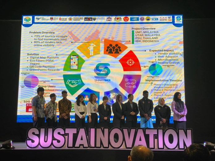 Aula megah penuh mahasiswa S1–S2 dari Malaysia, Thailand, dan tamu undangan lain. Booth teknologi bersinar macam gadget masa depan—bikin yang nggak paham pun pura-pura paham biar nggak keliatan katro.