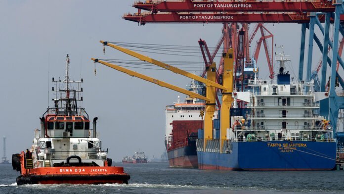 Kapal Pandu TB 034 berpatroli di perairan Pelabuhan Tanjung Priok. Dengan teknologi dan fasilitas modern, Tanjung Priok mampu layani kapal generasi mutakhir yang secara langsung menuju ke berbagai pusat perdagangan internasional (direct call). HARNAS.ID | BARRI FATHAILAH